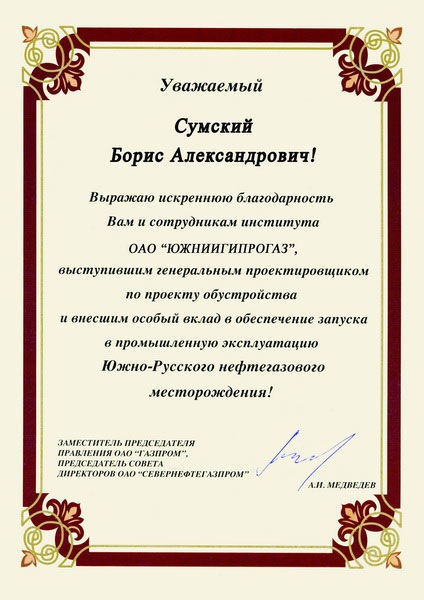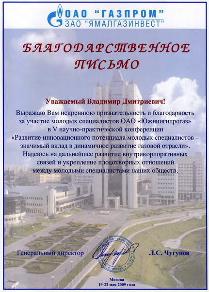 На основании изложенного прошу принять благодарность за вклад, внесенный в дело строительство объектов газовой программы и желаю коллективу АО "ЮЖНИИГИПРОГАЗ" новых достижений и финансовой стабильности.