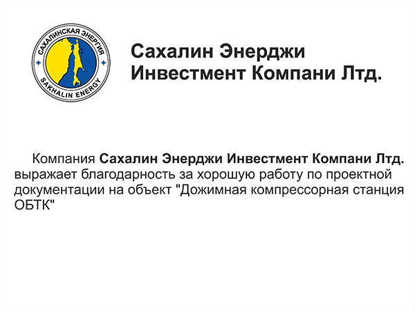 Компания выражает благодарность за хорошую работу по проектной документации на объект "Дожимная компрессорная станция ОБТК"