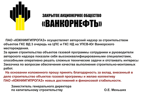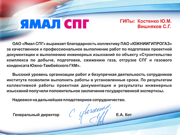 ОАО "Ямал СПГ" выражает благодарность коллективу АО "ЮЖНИИГИПРОГАЗ" за качественное и профессиональное выполнение работ по подготовке проектной документации и выполнению инженерных изысканий по объекту "Строительство комплекса по добыче, подготовке, сжижению газа, отгрузке СПГ и газового конденсата Южно-Тамбейского ГКМ".