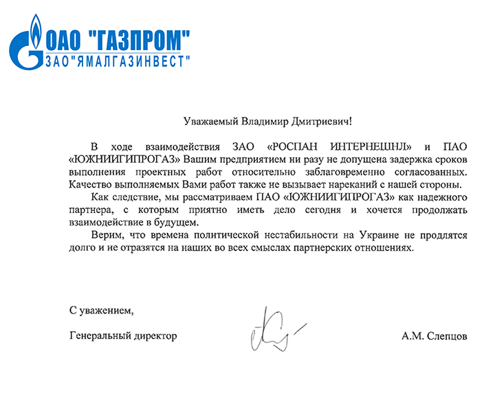 В ходе взаимодействия ЗАО "РОСПАН ИНТЕРНЕШНЛ" и АО "ЮЖНИИГИПРОГАЗ" Вашим предприятием ни разу не допущена задержка сроков выполнения проектных работ относительно заблаговременно согласованных. Качество выполняемых Вами работ также не вызывает нареканий с нашей стороны.