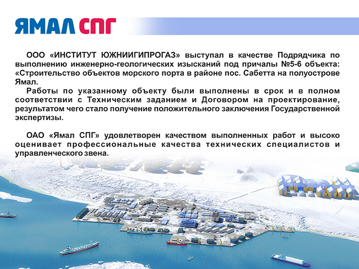 ООО "ИНСТИТУТ ЮЖНИИГИПРОГАЗ" выступал в качестве Подрядчика по выполнению инженерно-геологических изысканий под причалы №5-6 объекта: "Строительство объектов морского порта в районе пос. Сабетта на полуострове Ямал.