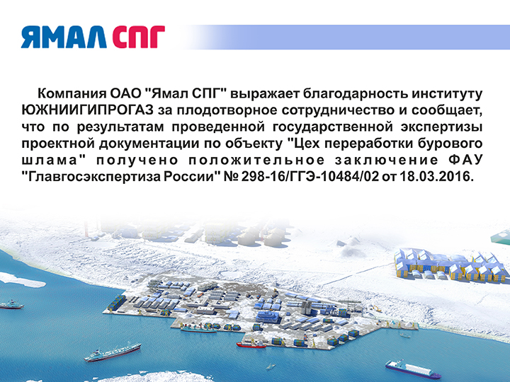 Компания ОАО "Ямал СПГ" выражает благодарность институту ЮЖНИИГИПРОГАЗ за плодотворное сотрудничество и сообщает, что по результатам проведенной государственной экспертизы проектной документации по объекту "Цех переработки бурового шлама " получено положительное заключение ФАУ "Главгосэкспертиза России" № 298-16/ГГЭ-10484/02 от 18.03.2016.