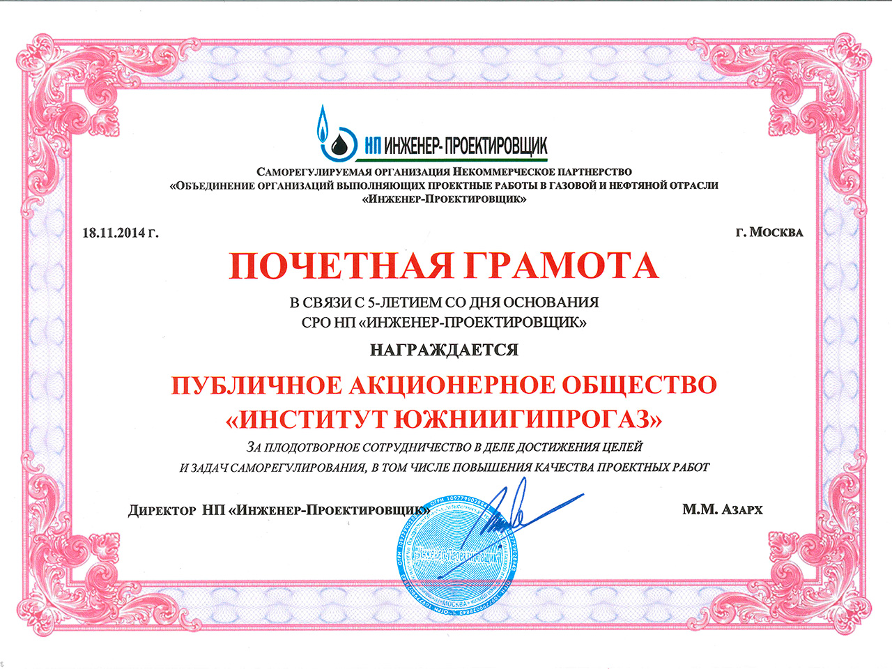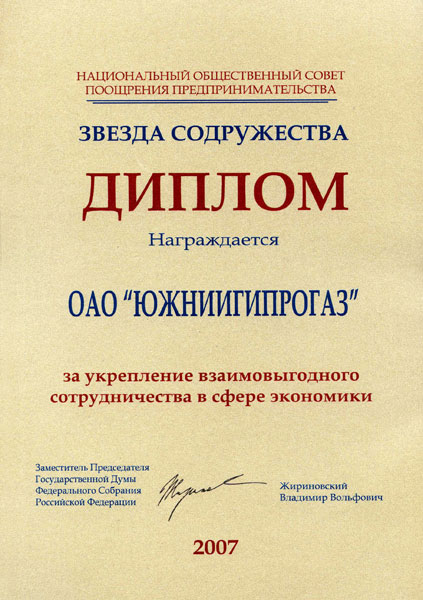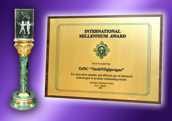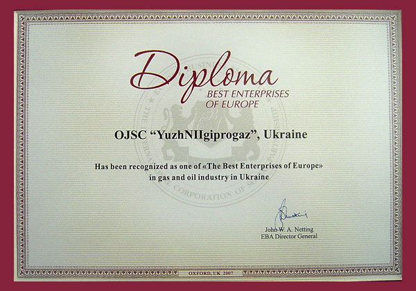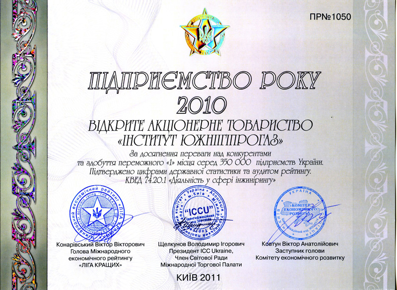 • В 2012 году, На основании официальных данных государственной статистики решением Оргкомитета Национального бизнес-рейтинга в Украине АО "ЮЖНИИГИПРОГАЗ" включено в ТОП-30 предприятий лидеров по совокупности показателей финансово-хозяйственной деятельности с присуждением звания "Лидер отрасли 2012";