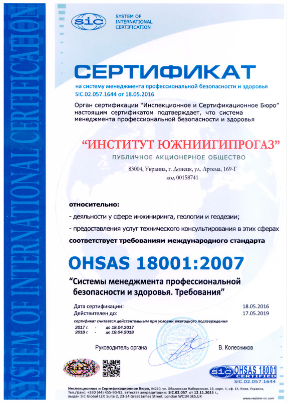 • Система управления охраной труда – требованиям международного стандарта OHSAS18001:2007 (сертификат № SIC M.S. 001 644 от 20.05.2019).